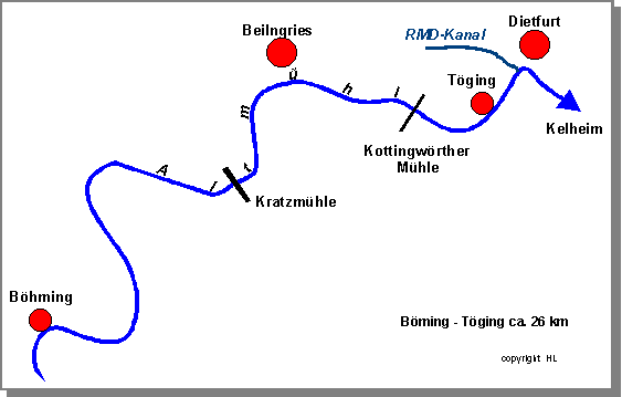 | Der Nebel wird immer dichter, das Thermometer zeigt 7,5 Grad. Ganz schön frisch für einen Septembertag. Von Riedenburg ist wegen des dichten Schleiers nichts zu sehen, der Fluss lässt sich links nur erahnen, wo die Schemen des Auwaldes in flaches Grau übergehen. Es ist nicht mehr weit bis zu unserem Treffpunkt: Töging, „..nach dem Ortsschild links, an der alten Eisenbrücke", so hat es mir Reinhold am Telefon beschrieben. Kurz vor dem Ziel, bei Dietfurt, reißt plötzlich der Nebel auf, strahlende Sonne taucht das malerische Tal in freundliches Licht. Hier endet die ursprüngliche Altmühl und geht über in den Rhein-Main-Donaukanal. Wir wollen die Strecke oberhalb von Böhming bis Töging befahren. Zirka 25 Kilometer auf einem der beliebtesten Flüsse Bayerns. Nach mehrtägigem Regen haben wir idealen Wasserstand, nun zeigt sich auch eine recht ordentliche Strömung. Romantisch verschlafen überquert die alte Eisenbrücke den Fluss, etwas außerhalb der Ortschaft, scheinbar nur für Wanderer, Radfahrer oder Kanuten interessant. Ich genieße die Stille und Einsamkeit. Der Tau glitzert auf den vertrockneten Pflanzen am Ufer, teilweise übersponnen von kunstvollen Netzen. Die Kamera heraus und einige Fotos machen, da tauchen auch schon Reinhold und Martin auf, zwei wunderschöne Holzkanadier auf dem Autodach. Der Einsatzpunkt an der Brücke in Böhming ist für Bootsfahrer präpariert. Wie auch die vielen anderen Ein-/ Aussatzstellen am Fluss. Die beiden Wehre, die wir zu umtragen haben, sind leicht zu bewältigen, nicht zuletzt wegen der vorbildlich angelegten und markierten Anlandestellen. Das wenige Gepäck ist schnell verladen und schon stechen wir los, werden von der Strömung mitgenommen und gleiten vorbei an zurücktretenden Felswänden, die sehr schnell einem weiten, lieblichen Tal weichen. Wir sind ganz allein unterwegs, auch auf der nahe liegenden Straße entlang der Altmühl ist heute kaum Verkehr. Ein wunderschöner, strahlender Sonntagvormittag, nur das Eintauchen der Paddel stört die Stille. Es ist trotz der Sonne ziemlich frisch, der aufkommende leichte Wind verstärkt dies noch, klärt aber die Luft und spendiert eine hervorragende Sicht auf die teilweise steilen Uferhänge in der Ferne. Diese markieren den Flussverlauf, sein Bett vor vielen Tausend Jahren. Mit ihren fast 200 Kilometern ist die Altmühl der einzige längere Wasserlauf Deutschlands, der in der Hauptrichtung nach Südosten fließt. Quelle und Mündung bei Kelheim weisen einen Höhenunterschied von nur 100 Metern auf, daher auch die träge Strömung. Trotzdem wurde der Fluss früher zum Antrieb vieler Mühlen genutzt. Es geht vorbei an saftigen Feuchtwiesen und Äckern, Auwald ist nur im Ansatz vorhanden, beschaulich windet sich der Fluss durch die weite Tallandschaft. Wir kommen erstaunlich flott vorwärts, nach gut zwei Stunden taucht das erste Wehr und zugleich unser Ziel für die Mittagspause vor uns auf: die Kratzmühle. Ein schattiger Platz am Wasser ist wie geschaffen für eine Rast. Reinhold öffnet seinen Packsack und holt die Utensilien zum Grillen hervor. Er hat sogar Birkenholz- und Buchenscheite dabei und kurz darauf knistert das kleine Feuer im Metallsieb. Martin hat schon Holzspieße geschnitzt und wir stecken die gewürzten Kotellettscheiben auf. Folienkartoffeln wandern in die Glut und wir genießen ein ausgiebiges, schmackhaftes Trappermenü. Da wir schon die Hälfte der Strecke hinter uns haben, lassen wir uns Zeit und starten erst am frühen Nachmittag wieder. Vorbei an Beilngries, später das Wehr an der Kottingwörther Mühle. Es begegnet uns das erste Boot auf dieser Tour. Und es wird auch das einzige bleiben. Ich kann es gar nicht fassen, dass wir den Fluss heute ganz für uns allein haben. Bisher hatten mich stets die Erzählungen und Berichte von einer Befahrung abgehalten: Die Altmühl, heißt es immer wieder, sei überfüllt wie eine Autobahn. Dies gilt sicherlich für die Hauptsaison, da sollte man den Fluss meiden. Wir erreichen unseren Zielpunkt Töging am späten Nachmittag in dem Bewusstsein, eine herrliche Fahrt an einem idealen Tag hinter uns zu haben - ein wahres Geschenk! Informationen und Literatur: Ruhiger, einfach zu fahrender Wanderfluss; Wehre gut zu umtragen, da die Altmühl als Flusswanderweg ausgebaut ist. Zahlreiche Zelt- und Rastmöglichkeiten, etliche Campingplätze; bei niedrigem Wasserstand Befahrung nicht empfehlenswert. Autobegleitung gut möglich, Einkehrmöglichkeiten entlang der Strecke ( teilweise Hinweisschilder ). Bendig E./Keller W.E. „Bootswandern auf der Altmühl"Verlag W. Keller, Treuchtlingen ( mit Flusskarte; informatives, handliches Büchlein ) „DKV-Wanderführer für Bayern", DKV-Wirtschafts- und Verlags GmbH, Duisburg Nejedly H. „Kanuwandern in Süddeutschland", BLV-Verlagsges.mbH, München „Wassersport-Wanderkarte Deutschland Südost" (Nr.4), Büro f. Kartographie E.Jübermann, Uelzen Internet: